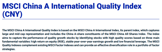 现在我们最大的好奇,就是“质量”是什么意思了?需要研究一下指数。这个指数是MSCI中国A股国际质量交易型开放式指数,即“MSCI China A International Quality Index (CNY)”。我们来看看指数的编制规则。