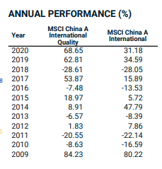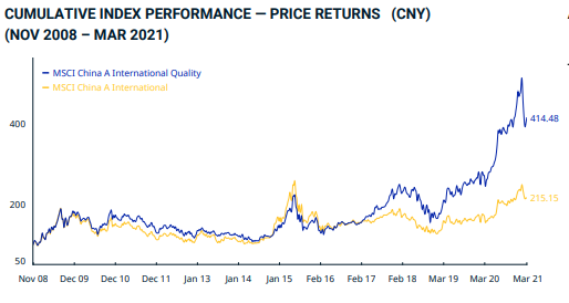 从2008年到2021年3月的表现来看,收益是显著超过MSCI A股指数的,特别是从外资大幅流入A股开始,走势更是惊人。
