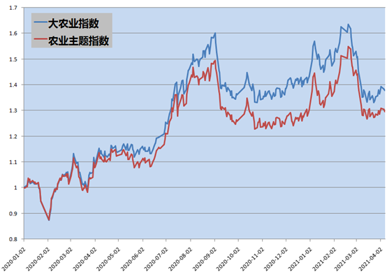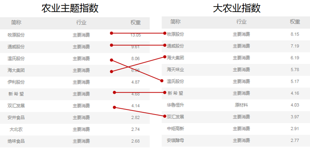 大农业指数中成分股更为平均,受牧原和通威两大龙头影响更小;