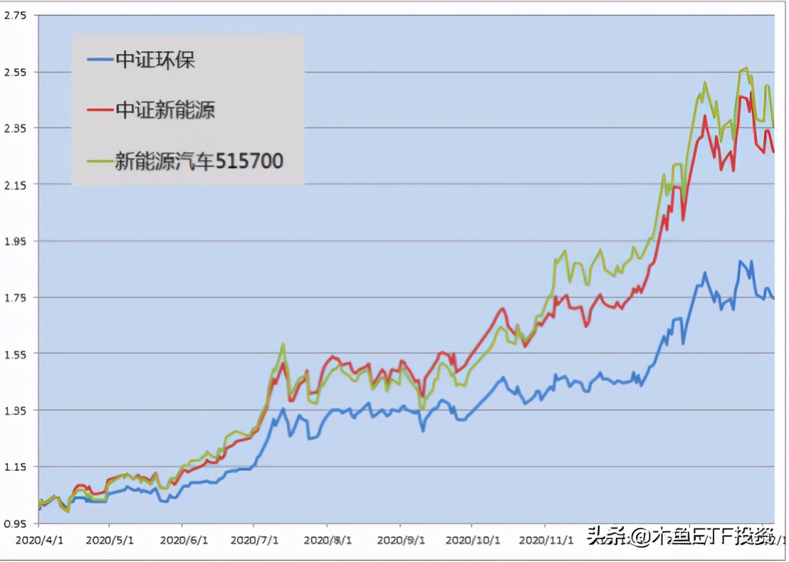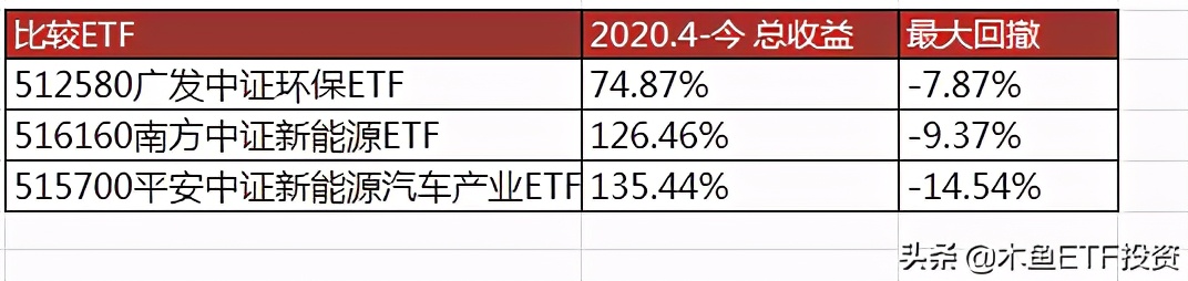 我们把环保、新能源以及新能源汽车ETF从2020年4月以来的走势做了一个量化对比,可以看到,三者的走势是极为相似的。新能源汽车最强,环保最稳,新能源指数则是收益上略低于新能源汽车ETF。