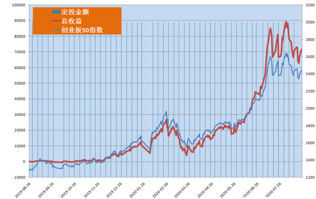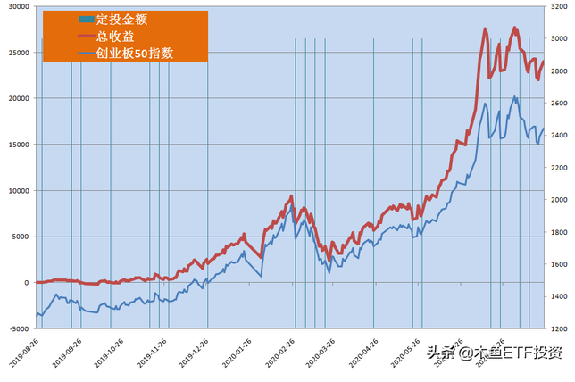 本策在50周内周周都投,投入本金15万元,收益超过7万元。而且只需要闭眼在每周五收盘前下单即可,因为相信被跟踪的ETF是长牛的,任何短期损失都是暂时的。