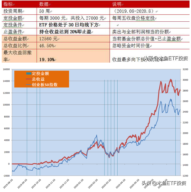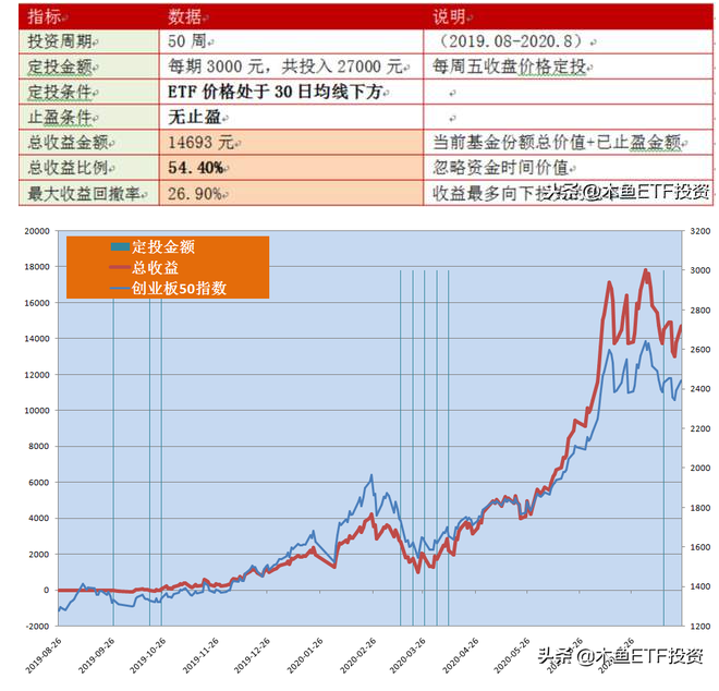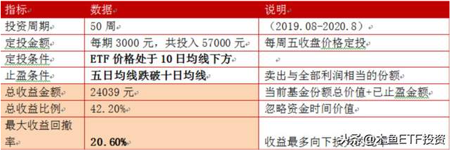 此策有一定的入场条件,也就是在ETF的30日均线下方才进行定投,高于30日均线则等待收益,会审时度势考虑出入场时机,这样能够大大提升投资的成功率和盈利比例。