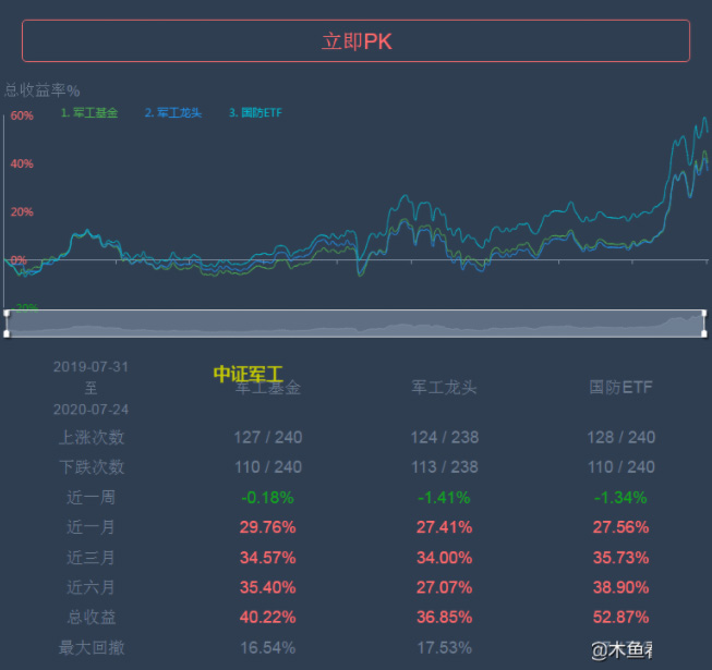 从上图分析结果来看,中证军工指数史回撤和最近一周跌幅最小,近一个月收益也最高,而国防指数历史收益最高。军工龙头则介于二者之间。