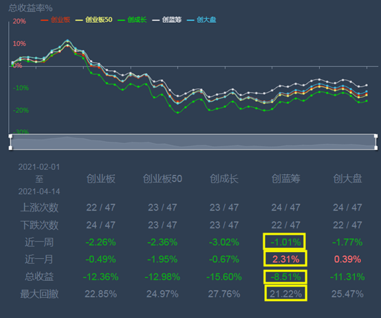 那么如果拉近到2月以来的统计,那么我们就能发现弱市中创蓝筹明显少亏,更加稳健,而创成长损失最大。