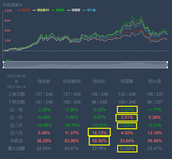 先看过去一整年的表现。主要关注收益和回撤指标。可以看到,创成长收益是绝对领先,但同时回撤也最大。创蓝筹收益最低,回撤也最小。