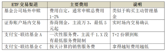 首先看一下主要的渠道和大体的费用情况,这里说明一下,ETF不管渠道是什么,最终持有基金都是有管理费托管费甚至什么巧立名目的指数授权费的,通常会直接按天扣在净值里,因此这里就不单列了。对于联接基金,可以购买渠道很多,这里仅仅以支付宝
