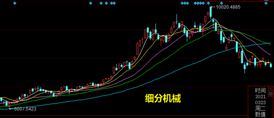 我们把新能源汽车的走势拿来看看,就能发现和细分机械的K线走势是80%一致的。无他,龙头股都是宁德时代以及我们耳熟能详的“抱团股”,涨跌规律自然考得很近!