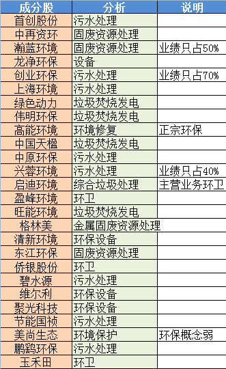 只成分股如上图,我们对这些成分股做了粗略地分析,其中直接与传统意义上的环保有联系的就有