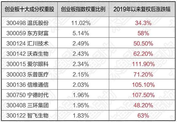 目前市场大部分指数是有限样本股指数,比如上证50、创业板指数、沪深300指数等。这类指数的成分股是经过指数发布公司精挑细选的,能够反映出指数特色,可以说是代表了指数指向类别中最好的上市公司的组合。例如,创业板指数虽然指示创业板总体的走势,然而其指数编制规则是按市值排名前100的个股的加权平均数,而越靠前的成分股占的权重越高。以下是指数权重前10的个股自2019年以来的权重比例及复权后涨跌幅。