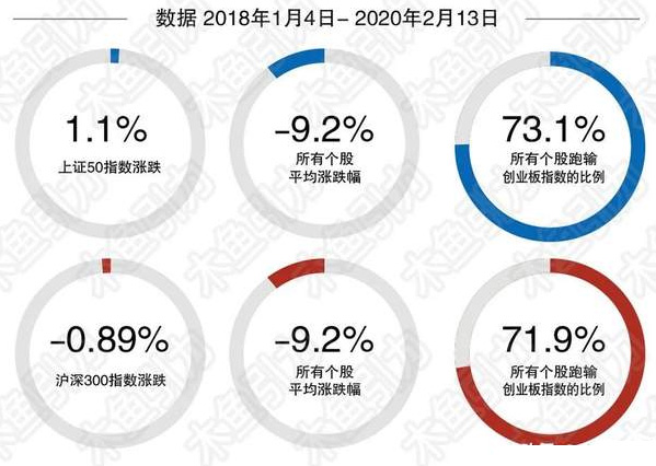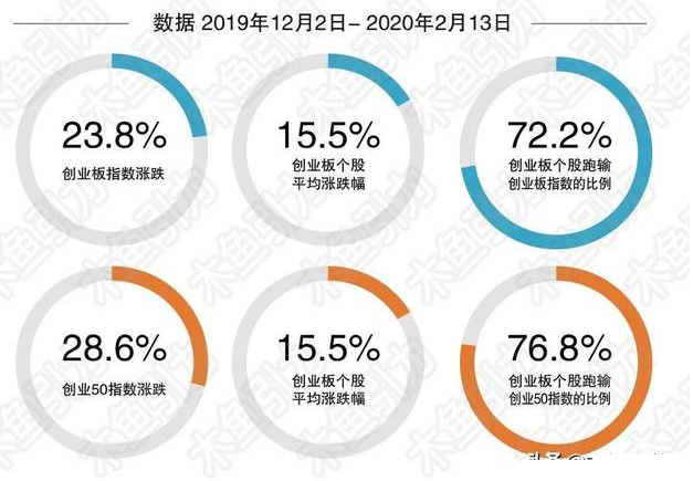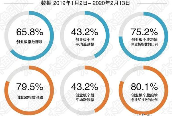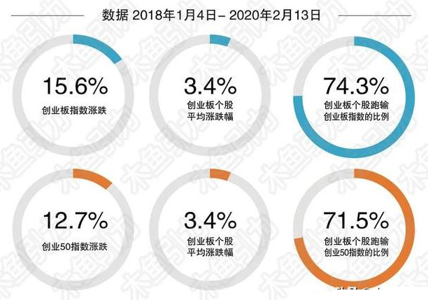 诚然,三个月以来创业板指数乃至创业50指数涨幅可观。然而木鱼发现,创业板个股的平均涨幅远远落后于指数,可以推断热衷于自己投资股票的众多中小投资者并没有获得与之匹配的收益。另一个统计数据是,超过七成的个股跑输指数,这轮行情中个股被指数狂甩是确定的!当然,我们理解,由于疫情造成的短暂波动而恐慌,很多投资者没有完全参与到这波行情之中;或者由于越涨越不敢买的散户逻辑而袖手旁观。那么,有人说了,这个行情比较特殊,那么木鱼拉长一下行情的历史,看看统计数据会有什么变化。特别是2018年开始的统计更有说服力,毕竟2018年算是大熊市,2019年是小牛市,结合起来我们看看情况。